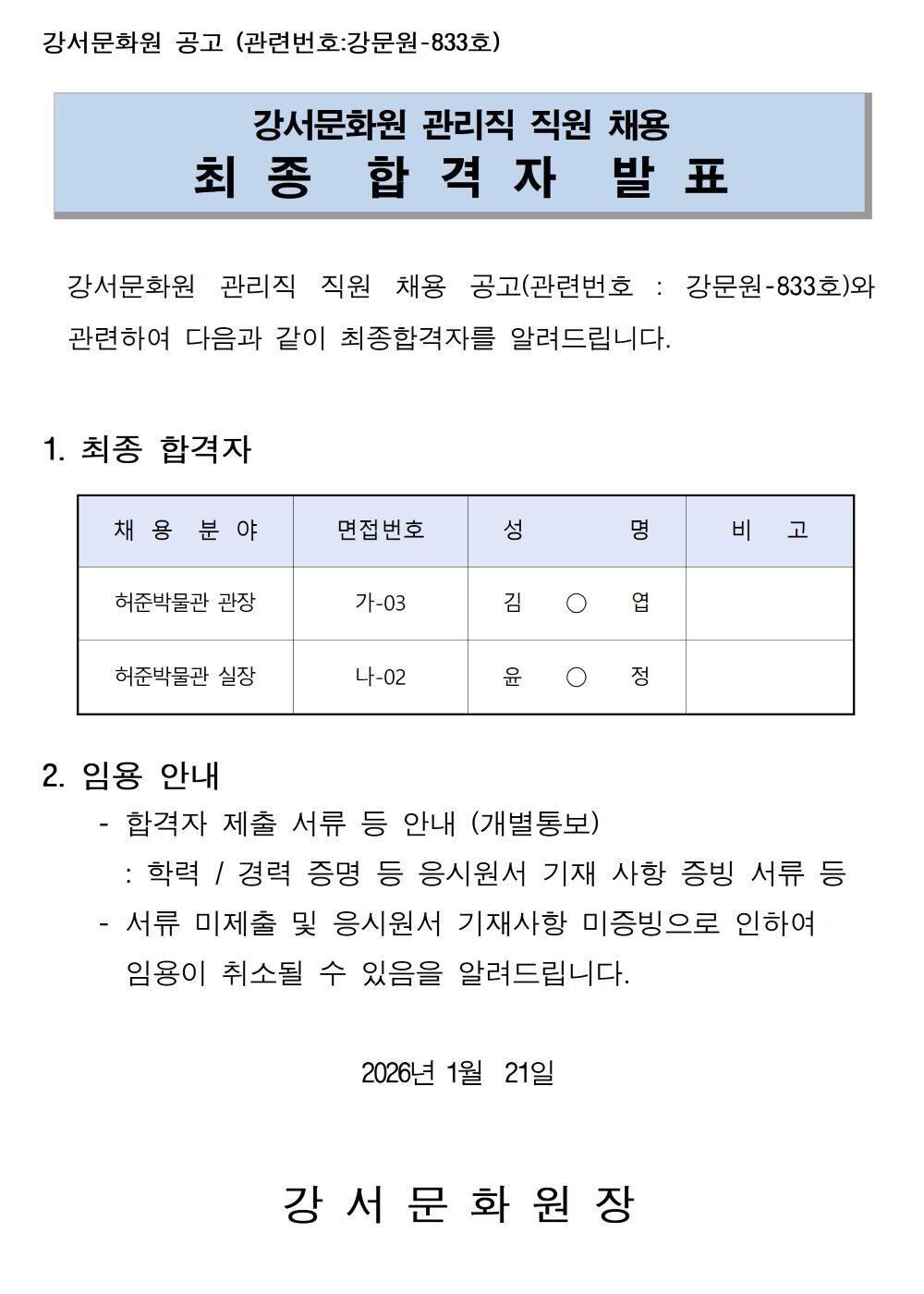 강서문화원 관리직(허준박물관) 직원 채용 최종합격자 발표